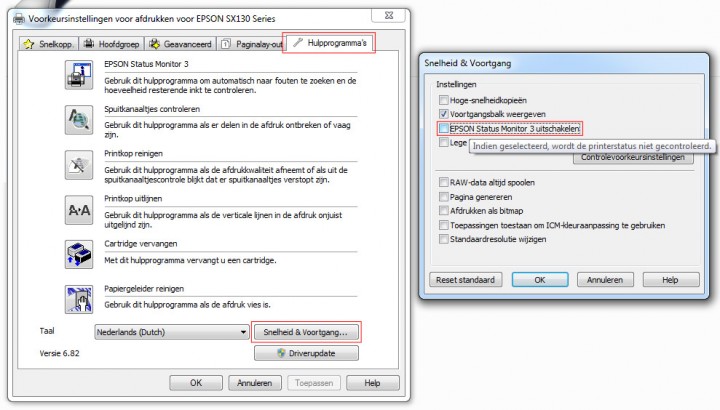 In Extra instellingen Vinkje voor Epson status 3 inschakelen weg gehaald.