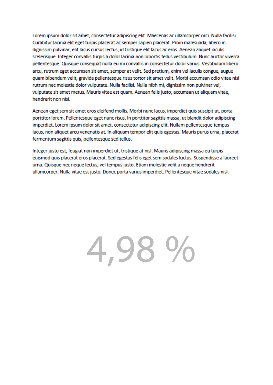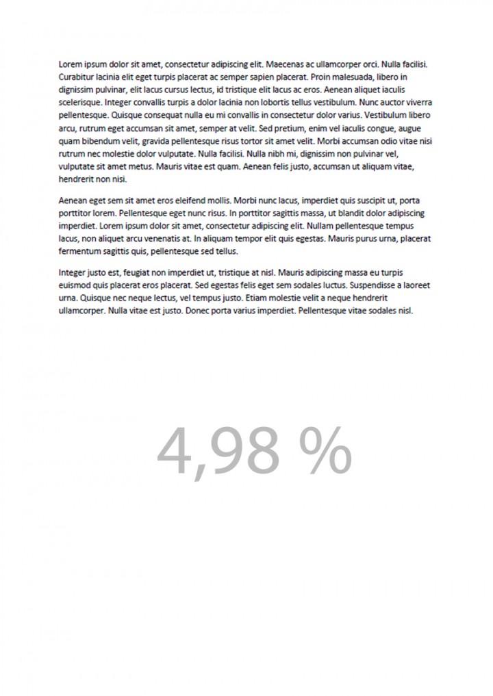 In onze test maakten we gebruik van het “gratis voor 30 dagen” programma APFill. Onderstaande pagina bevat 254 woorden (1.507 tekens) in het standaard Microsoft Word lettertype ‘Calibri’ 11 punt en deze heeft een paginavulling van 4,98%. Met APFill kun je gemakkelijk berekenen hoeveel dekking een pagina bevat en wat dit betekent voor de hoeveelheid pagina’s die je kunt printen.