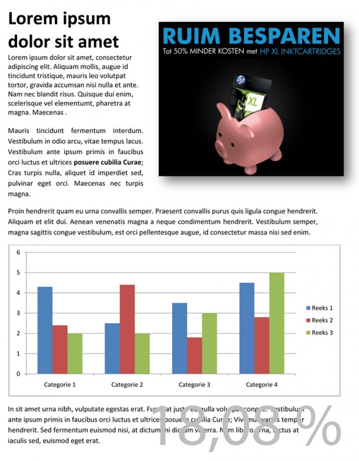 Zoals te zien is deze 5% niet erg veel – circa 2 paragrafen tekst. Print jij, zoals bijna iedereen, meer dan dit op een pagina, dan moet je de paginaverwachting hierop aanpassen. Een volle pagina is al snel een 10 of 12% dekking. Met foto’s zit je al snel aan de 20%. En een over het algemeen vrij blanco DVD cover zit al tegen de 35%.