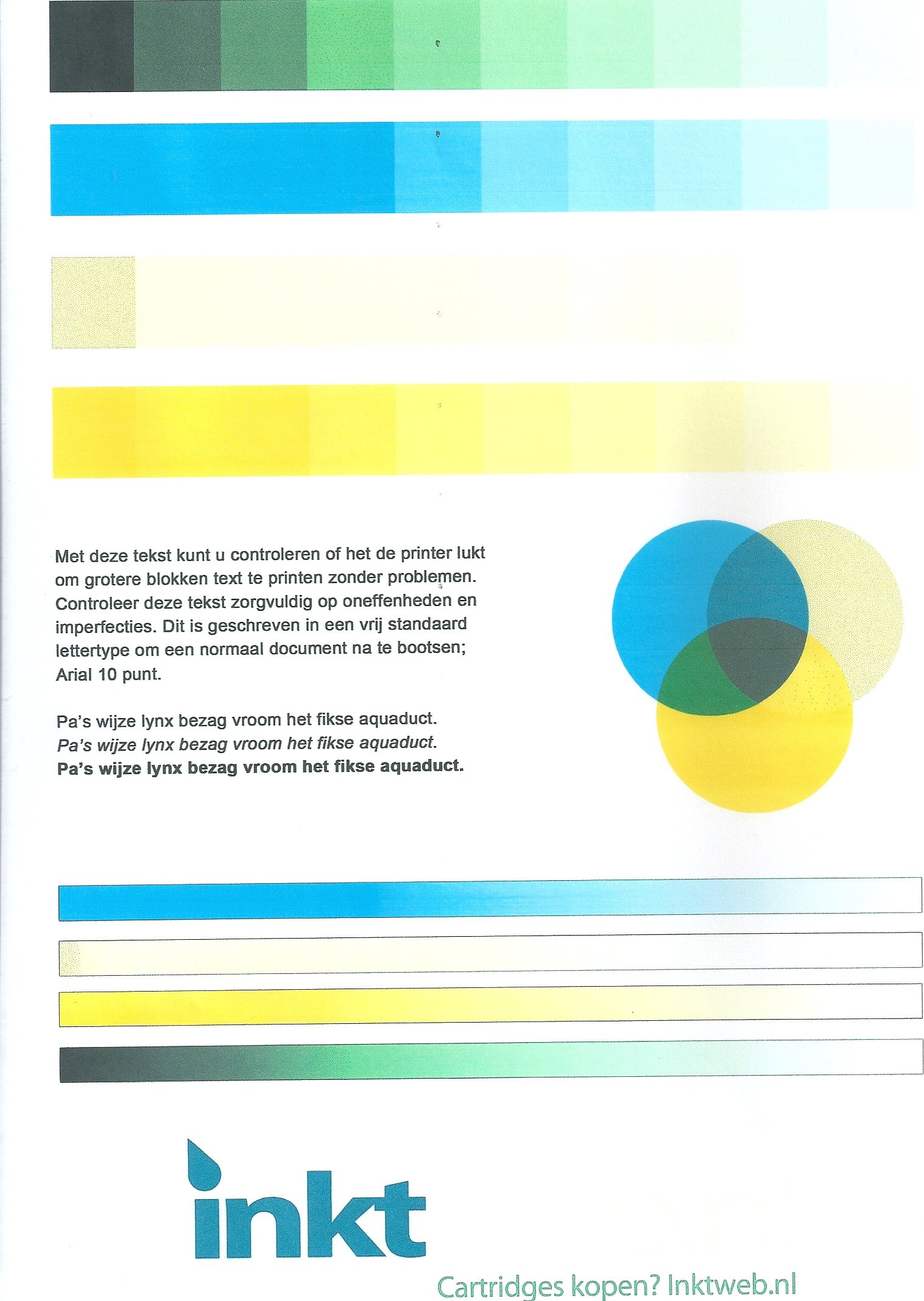 Om die reden hebben wij zelf een testpagina ontworpen. Zo kun je met de Inktweb.nl testpagina de overloop van de kleuren bekijken maar kan je ook gemakkelijk zien of de kleuren goed mengen. Dit is handig als je er niet uitkomt wélk van de drie kleurencartridges problemen geeft.