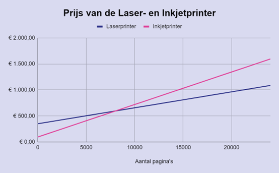 In de volgende grafiek is duidelijk te zien dat na veel afdrukken de Laserprinter een enorm stuk voordeliger is dan de Inkjetprinter. Voor thuisprinten wordt dus hierom aangeraden een Inkjetprinter aan te schaffen waar ‘grotere kantoren’ beter af zouden zijn wanneer zij kiezen voor een laserprinter.