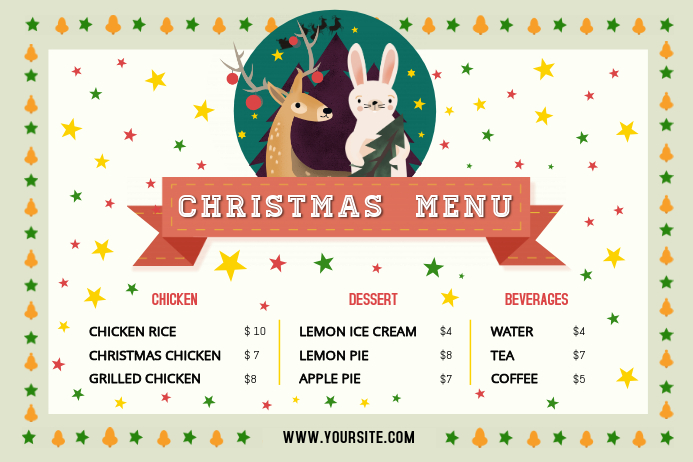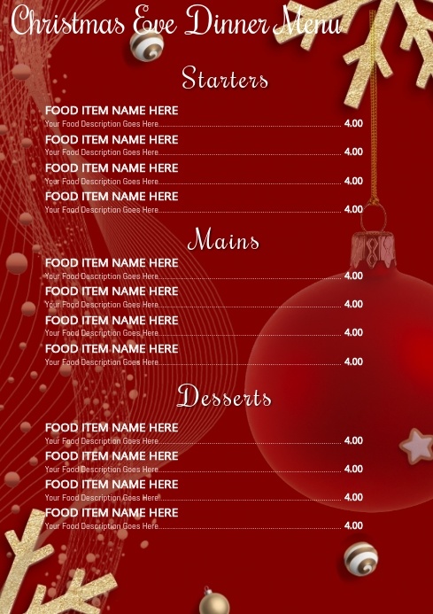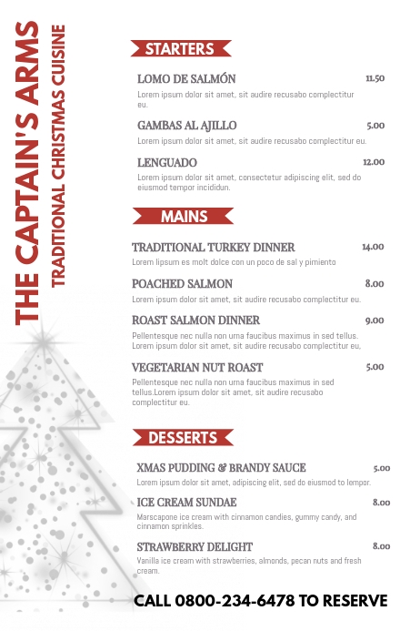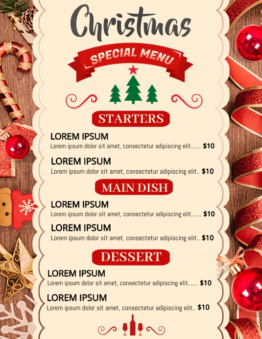 Met deze gezellige menukaart geef je jouw gasten een warm gevoel als zij een lekker gerecht uitkiezen. Met de decoratieve zijkanten met allerlei kerst-gerelateerde objecten zet jij een avond neer van 5 sterren kwaliteit!