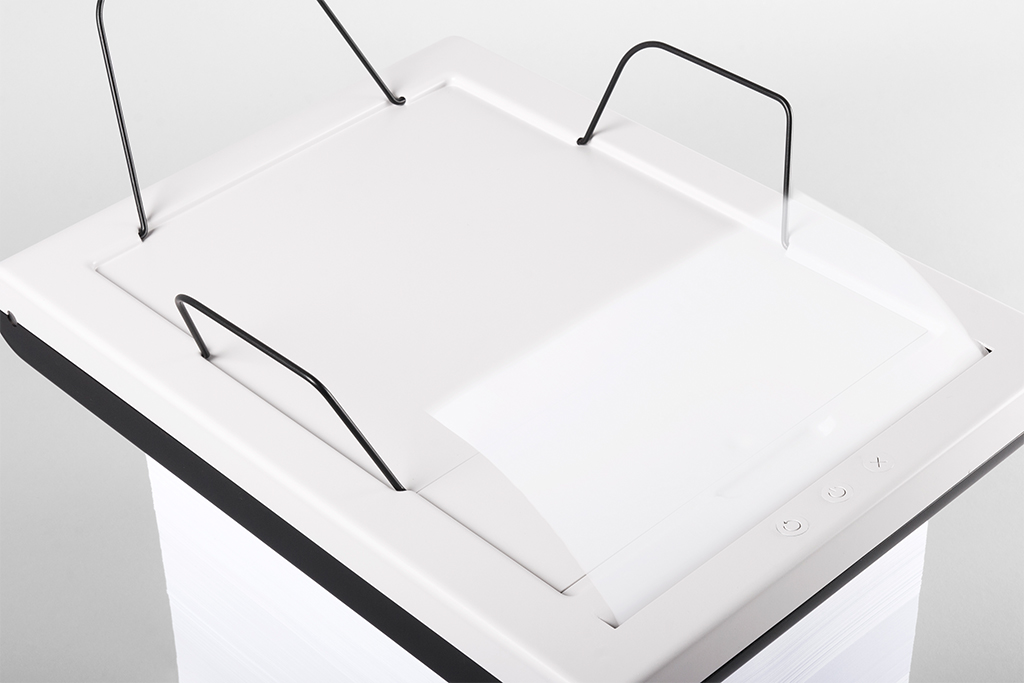 Voor zijn afstudeer project heeft Mugi Yamamoto een wel heel unieke printer bedacht. Het meest opvallende aan deze printer is niet het strakke ontwerp (hoewel het een erg mooie printer is) maar op de manier hoe deze printer het papier verbruikt. De “Stack”, zoals de printer heet, heeft geen klassieke papierladen. Je plaats de printer namelijk op een stapel papier die de printer één voor één bedrukt met jou afdruk en daarna bovenop de printer legt. Zo gaat de Stack door het papier heen .
