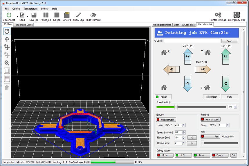 De aanbevolen printsoftware is Repetier-Host. Dit is een programma dat van een 3D ontwerp in STL formaat allemaal lijntjes kan maken en de printer de opdracht kan geven welke route er afgelegd moet worden om het object te printen. Dit wordt gedaan met behulp van de Plug-in Slic3r. De software communiceert geweldig en de printer reageert snel op alle input. Het enige grote nadeel is dat het elke keer opnieuw volledig ingesteld moet worden op een nieuw printertype of een nieuw soort filament. Dit maakt het vervangen van het filament een langdurige klus, hier gaan we later wat dieper op in.