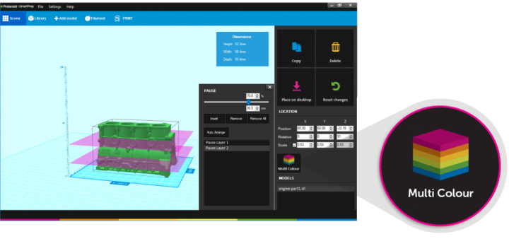 Naast het gemak van plug en play, beschikt de Polaroid PlaySmart 3D Printer over nog enkele unieke features die je in deze prijsklasse vrijwel niet tegenkomt. Zo beschikt hij over een LCD Touch scherm voor gemakkelijke bediening. De printopdrachten kunnen via SD kaart, USB, Wi-Fi of een via de speciale App van Polaroid worden overgedragen aan de printer. Daarnaast (en dit vinden we echt cool) kan de printopdracht real time in de gaten worden gehouden via de app voor Android of iOS door middel van de ingebouwde camera waar je precies kunt checken hoever de printer is met printen. Ook kun je in de App via een balkje zien op hoeveel procent van het proces je bent.
