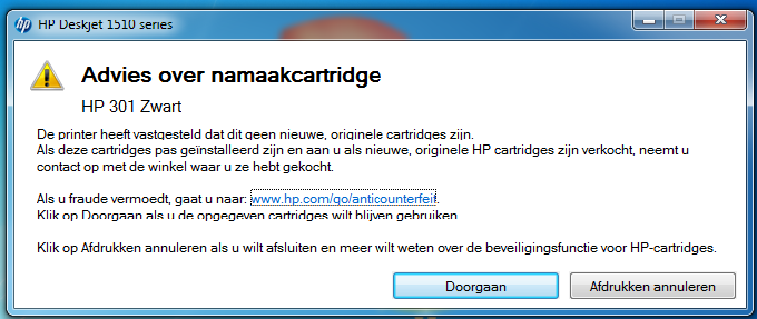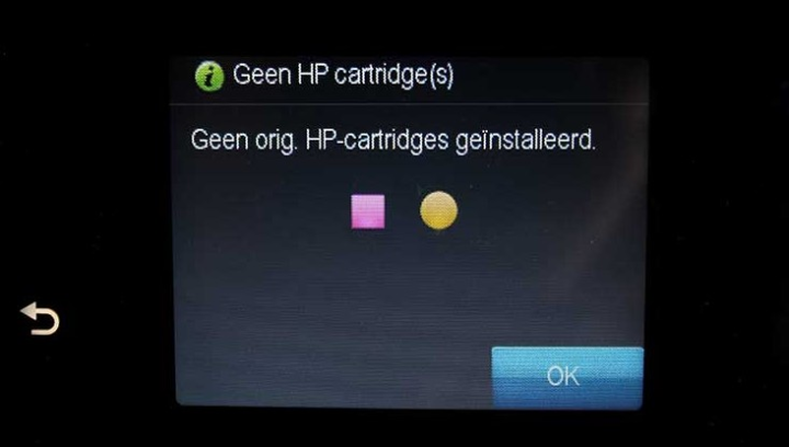 Originele merk inktpatronen en toners kunnen vaak duurder uit komen met de hoeveelheid die je voor die prijs krijgt, maar ze kunnen je niet verplichten om alleen originele merk printer verbruiksartikelen aan te schaffen om te kunnen printen. Gelukkig kun je deze melding op de computer makkelijk weg klikken, en via je printer op “OK” of “Doorgaan” drukken waarna je de huismerktoners gewoon kunt gebruiken.