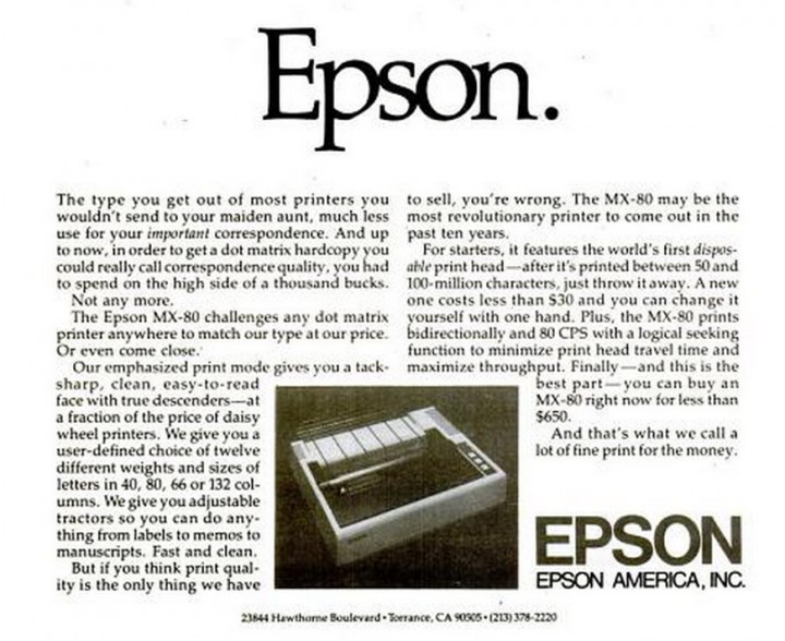 Epson MX80: Deze printer woog 7 kilo.  Het klinkt veel, tot je leest hoeveel de Canon printer weegt.