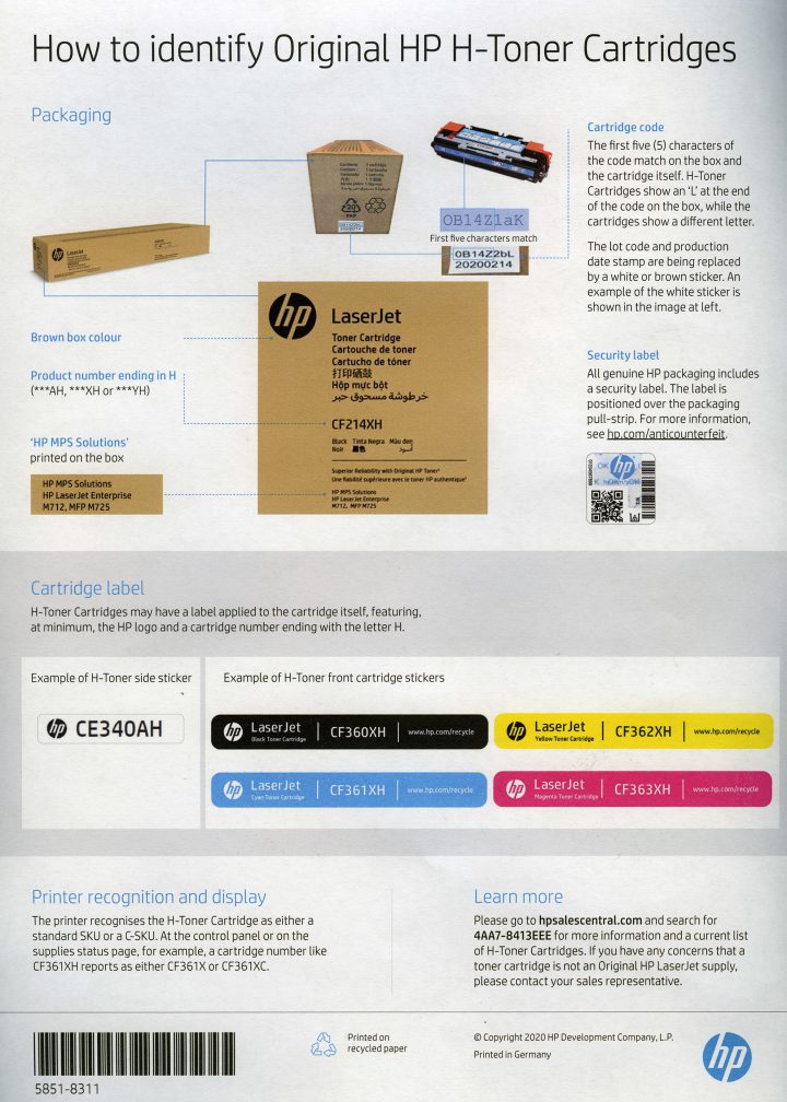 De holo-sticker is niet de enige manier om een originele HP contracttoner te herkennen. Op andere plaatsen op de doos en op de toner zelf staan verschillende codes vermeldt waarmee je kunt nagaan dat het om een officieel HP product gaat. Zie het onderstaande document van HP. Deze informatie is ook te vinden in de meeste HP contracttoner dozen.
