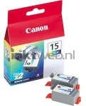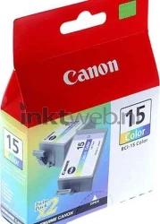 Een set van twee originele Canon BCI-15C inktcartridges kleur. De cartridges bevatten de kleuren cyaan, magenta en geel.
