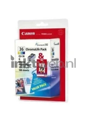 Originele Inktcartridge's voor de Canon CLI-36. Dit pak bevat de kleuren cyaan, magenta en geel. Capaciteit per inktcartridge: 249 pagina's (12ml). Dit pak bevat ook glansend foto papier voor de Canon GP-501. Dit zijn vellen van 4x6 inch en het zijn er in totaal 100.