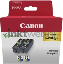 De Canon CLI-36 twinpack kleur is een multipack met 2 CLI-36 kleur cartridges! Hij beschikt over een capaciteit 498 pagina's en heeft een inhoud van 24 ml. Daarbij printen deze cartridges met scherpe en heldere kleuren en daarom is hij perfect voor foto's.