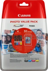 Originele Canon CLI-551 multipack cartridges (6508B005). Bevat de kleuren; geel, magenta, cyaan & 50 vellen fotopapier (10 x 15 cm).