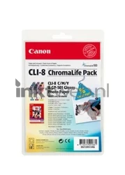 Originele CLI-8 chromalife inkt cartridges voor de Canon 0621B030 in drie kleuren cyaan, magenta en geel. Inclusief fotopapier, 4x6 50 vellen.