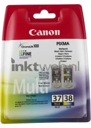 Orginele Canon PG-37 (11ml.) / CL-38 (9ml.) cartridge multipack. Dit betreft een zelf samengestelde bundel uit de losse kleuren (CL-38) en zwarte (PG-37) cartridge.