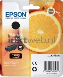 De zwarte Epson 33 (T3331) cartridge bevat hoge kwaliteit Claria Premium inkt. Hiermee print u de mooiste foto's en scherpe tekstdocumenten van indrukwekkende kwaliteit. Op ieder afdrukformaat zijn zelfs de kleinste details zichtbaar. De zwarte cartridge werkt optimaal samen met de kleurencartridges, om ook afbeeldingen en foto's van de juiste donkere details te voorzien.
