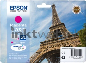 Originele T7023 inktcartridge voor de Epson WP4000 en de 5000 in de kleur magenta. Deze cartridge heeft een hoge capaciteit van 2.000 pagina's.