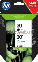 Originele HP 301 Original Ink Cartridge Combo 2-Pack. Deze verpakking bevat één zwart en één drie-kleuren HP 301 cartridge met elk een inhoud van 3 ml inkt. Voor de zwarte cartridge is dit goed voor circa 190 pagina's en de kleuren cartridge 165 pagina's op een pagina bedrukking van 5 procent.