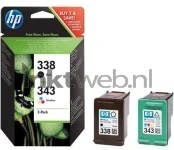 Originele HP 338/343 Combo-pack Inkjet Print Cartridges in de kleuren zwart, cyaan, magenta en geel.