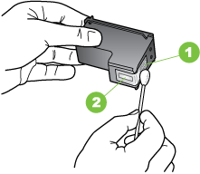 Maak met een licht vochtig wattenstaafje (of lintvrij doekje) de koperen contactpunten (1) of de chip van de cartridge schoon.