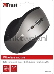 Deze Sura muis van Trust is draadloos te gebruiken. Naast de standaard linker, rechter en middelste muisknop (scroll-wiel) bevat deze muis nog 2 andere knoppen aan de zijkant en een knop waarmee u de gevoeligheid kunt wisselen tussen 800dpi en 1600dpi.