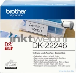 De Brother DK-22246 thermische labelrol. Breedte 103mm en een doorlopende lengte van 30 meter. Door de doorlopende tape is het ideaal voor labels van verschillende lengtes, bijvoorbeeld voor dossiers, mappen of bezoekerspassen. Deze papiertape (zwart op wit papier) bevat een permanente lijmlaag.