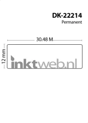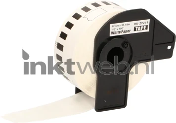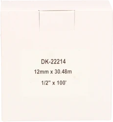 Huismerk als vervanger voor Brother DK-22214 thermische labelrol. Breedte 12mm en een doorlopende lengte van 30 meter. Door de doorlopende tape is het ideaal voor labels van verschillende lengtes, bijvoorbeeld voor dossiers, mappen of bezoekerspassen. Deze papiertape (zwart op wit papier) bevat een permanente lijmlaag.