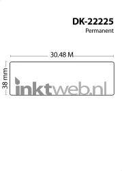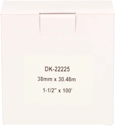 Huismerk als vervanger voor Brother DK-22225 thermische labelrol. Breedte 38mm en een doorlopende lengte van 30 meter. Door de doorlopende tape is het ideaal voor labels van verschillende lengtes, bijvoorbeeld voor dossiers, mappen of bezoekerspassen. Deze DK22225 papiertape (zwart op wit papier) bevat een permanente lijmlaag.