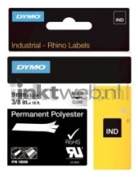 Dymo S0718160 Rhino tape permanent polyester zwart op transparant 9mm. De permanente lijmlaag is bestand tegen vocht, UV-licht enextreme temperaturen. De labels zullen na lange tijd nog goed op het oppervlak blijven plakken en niet omkrullen of loslaten.