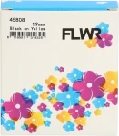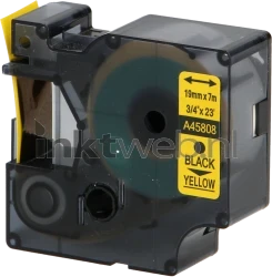 Dymo compatible label tape 45808. De lettertape bestaat uit zwarte letters op gele tape en is zelfklevend. Deze lettertape staat ook bekend als dymo S0720880 en is 7 meter lang en 19mm breed.