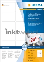 Zelfklevende etiketten op A4-vellen. Met Movables®-Technology: goed hechtend op alle gladde, droge, onbeschadigde en stofvrije oppervlakken, zonder achterblijvende resten weer te verwijderen zonder de ondergrond te beschadigen, kan probleemloos worden verwijderd en op een andere plek worden geplakt en meerdere keren worden gebruikt. Ideaal voor het tijdelijk of wisselend labelen en voor oppervlakken die niet mogen worden beschadigd. Zeer goede drukresultaten op alle laser- en inkjetprinters, kopieerapparaten, kleurenlaserprinters en kleurenkopieerapparaten. Storingvrije verwerking dankzij veiligheidsrand rondom en optimale vlakligging. Hoogwaardig speciaal papier, chloorvrij gebleekt, oplosmiddelvrije contactlijm. Etiketten zijn 100 % recyclebaar via het oud papier, verpakking van gerecycled karton. Gratis softwareoplossingen: www.herma.com/software.