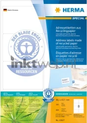 Adresetiketten 10827 van het merk Herma. Deze A4-etiketten zijn 99,1x67,7 millimeter, van natuurlijk wit gerecycled papier en zelfklevend. Een verpakking bevat maarliefst 800 adresetiketten, waarvan 100 stickervellen met elk 8 labels.