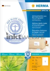 Zelfklevende etiketten van natuurlijk wit gerecycled papier, op A4-vellen. Ideaal voor het adresseren en labelen. Etiketten- en ondergrondmateriaal van 100% gerecycled papier, voorzien van het milieukeurmerk "Blauer Engel". Hoge witheidsgraad (ISO 97/CIE 133), zonder chloorbleek. Oplosmiddelvrije contactlijm op waterbasis. Etiketten zijn 100% recyclebaar via het oud papier, verpakking van gerecycled karton. Storingvrije verwerking dankzij veiligheidsrand rondom en optimale vlakligging. Zeer goede drukresultaten op alle laser-en inkjetprinters, kopieerapparaten, kleurenlaserprinters en kleurenkopieerapparaten. Gratis softwareoplossingen: www.herma.com/software.