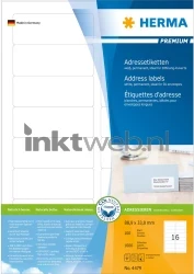 100 Herma 4479 A4-stickervellen in de kleur wit, 16 stickers per vel, totaal 1600 labels. Deze labels hebben een afmeting van 88,9x33,8 millimeter, zijn permanent hechtend en zelfklevend en te gebruiken voor alle laser- en inkjetprinters, kopieerapparaten, kleurenlaserprinters en kleurkopieerapparaten.