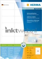 2400 A4-adresetiketten van Herma, 24 labels per vel. Deze permanent hechtende en zelfklevende 4645 labels zijn 63,5x33,9 millimeter, in de kleur wit en bedoeld voor alle laser- en inkjetprinters, kleurenlaserprinters, kopieerapparaten en kleurkopieerapparaten.