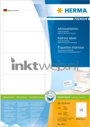 Deze 4667 verpakking van Herma bevat 100 A4-stickervellen met daarop 10 labels, in totaal 1000 labels. Afmeting 96x50,8 millimeter, wit van kleur, permanent hechtend en zelfklevend. De adresetiketten zijn geschikt voor alle laser- en inkjetprinters, kopieerapparaten, kleurenlaserprinters en kleurenkopieerapparaten.