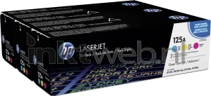 Originele HP 125A tonercartridges. Dit is een 3-pack en bevat 3 cartridges in de kleuren cyaan, magenta en geel met een standaard capaciteit van 1.400 pagina's per toner.