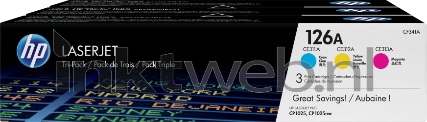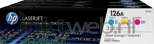 Originele HP CF341A tonercartridges, voordeel set met de kleuren cyaan, magenta en geel. Capaciteit 3 x 1.200 pagina's.