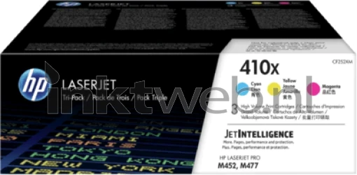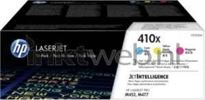 Originele HP 410X tonercartridges. Dit is een 3-pack en bevat 3 toners in de kleuren cyaan, magenta en geel met een hoge capaciteit van 15000
